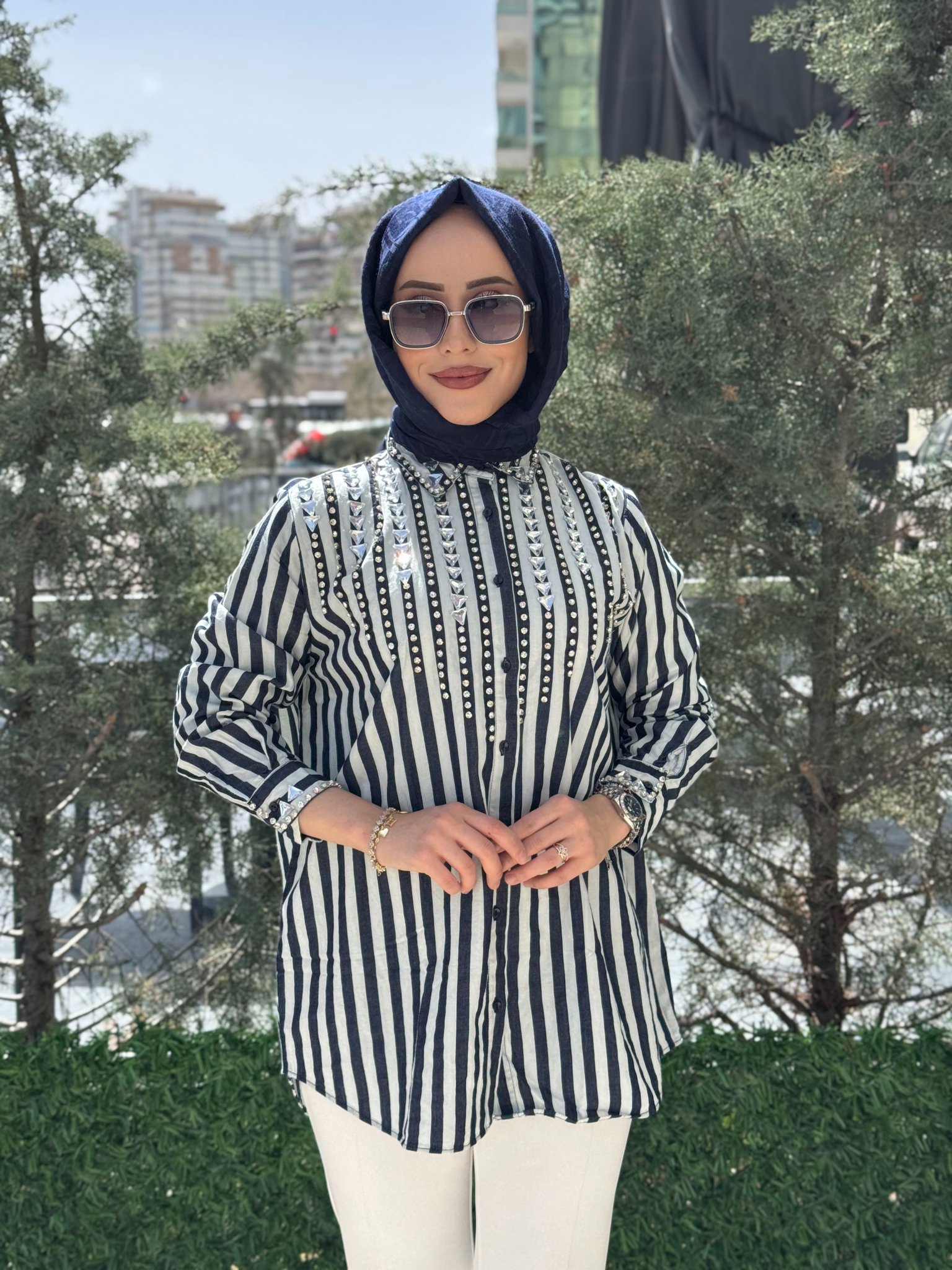 RENKLİ TAŞ DETAYLI OVERSIZE KESİM TENSEL GÖMLEK