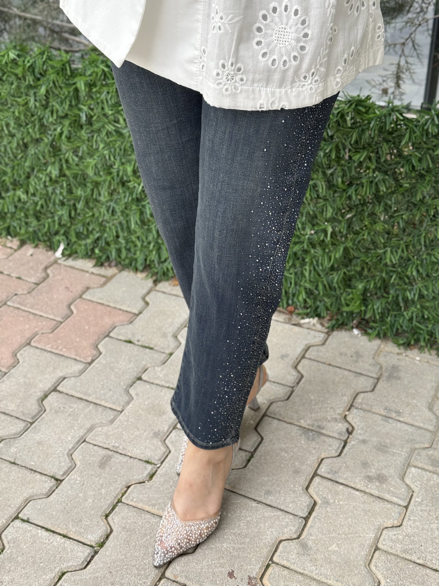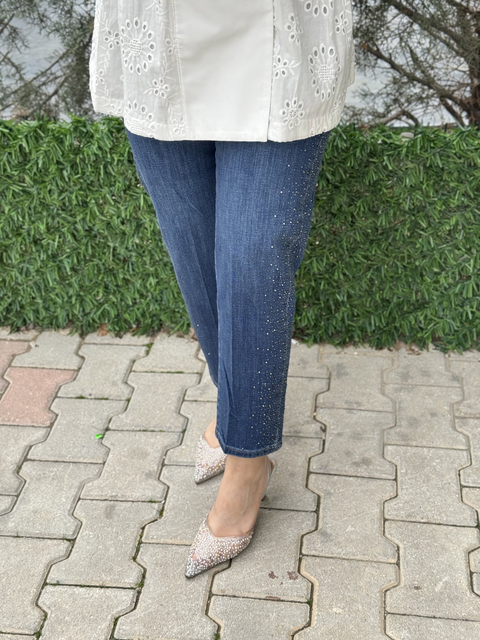 LA CARTE YAN ŞERİT TAŞ VE YIRTMÇ DETAY MOM KESİM KOT PANTOLON