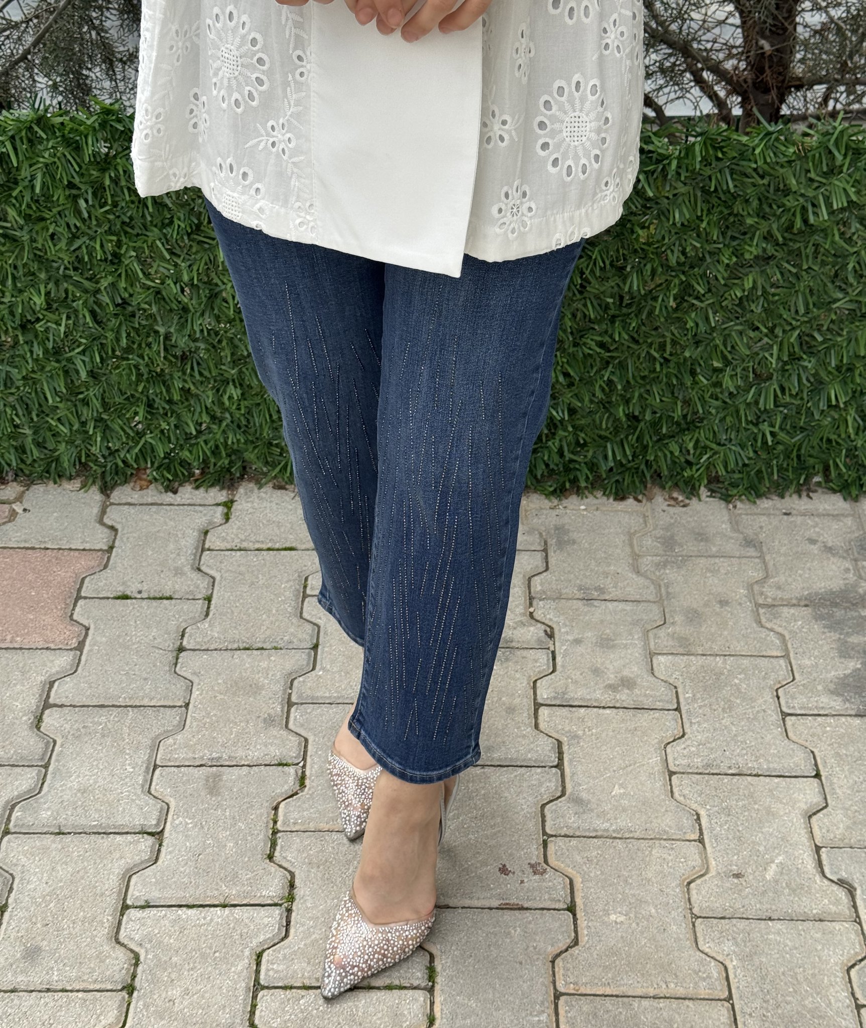 LA CARTE KENARI SERPME TAŞ SETAYLI MOM KESİM KOT PANTOLON