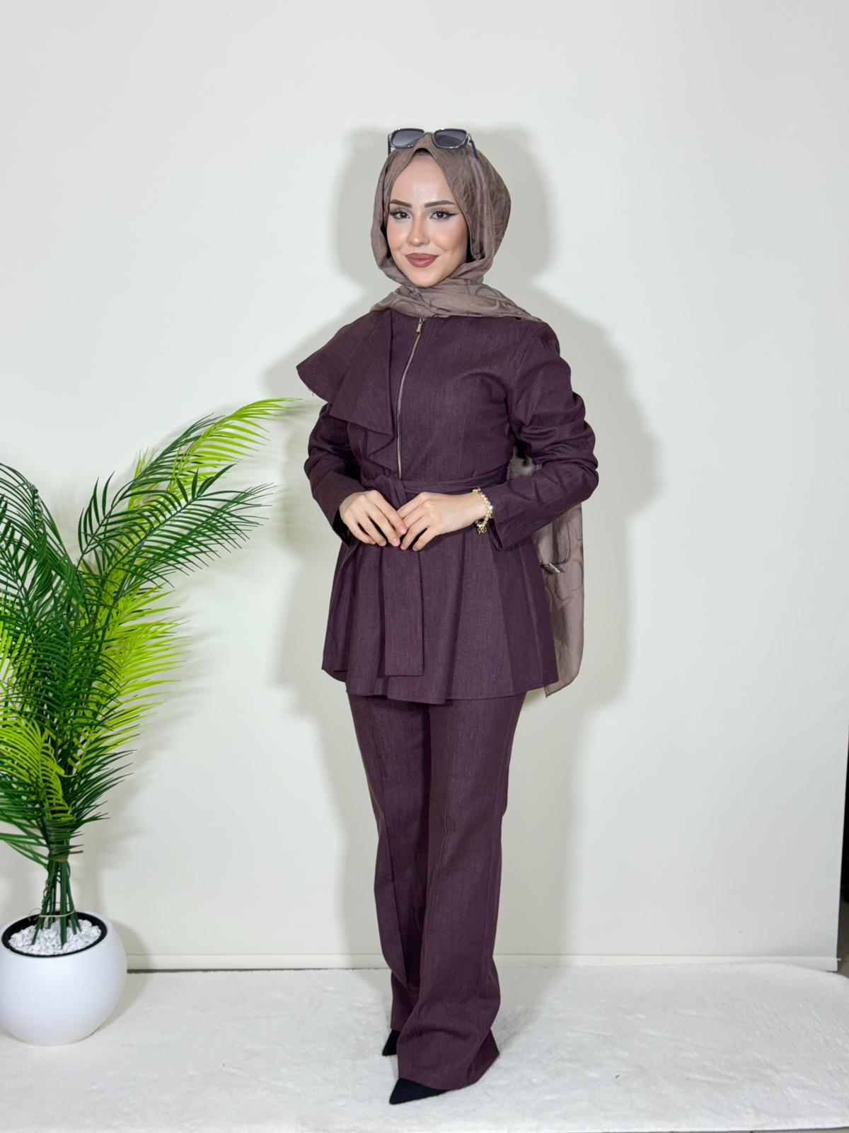 KREP KUMAŞ SERPME TAŞ DETAY PANTOLONLU TAKIM