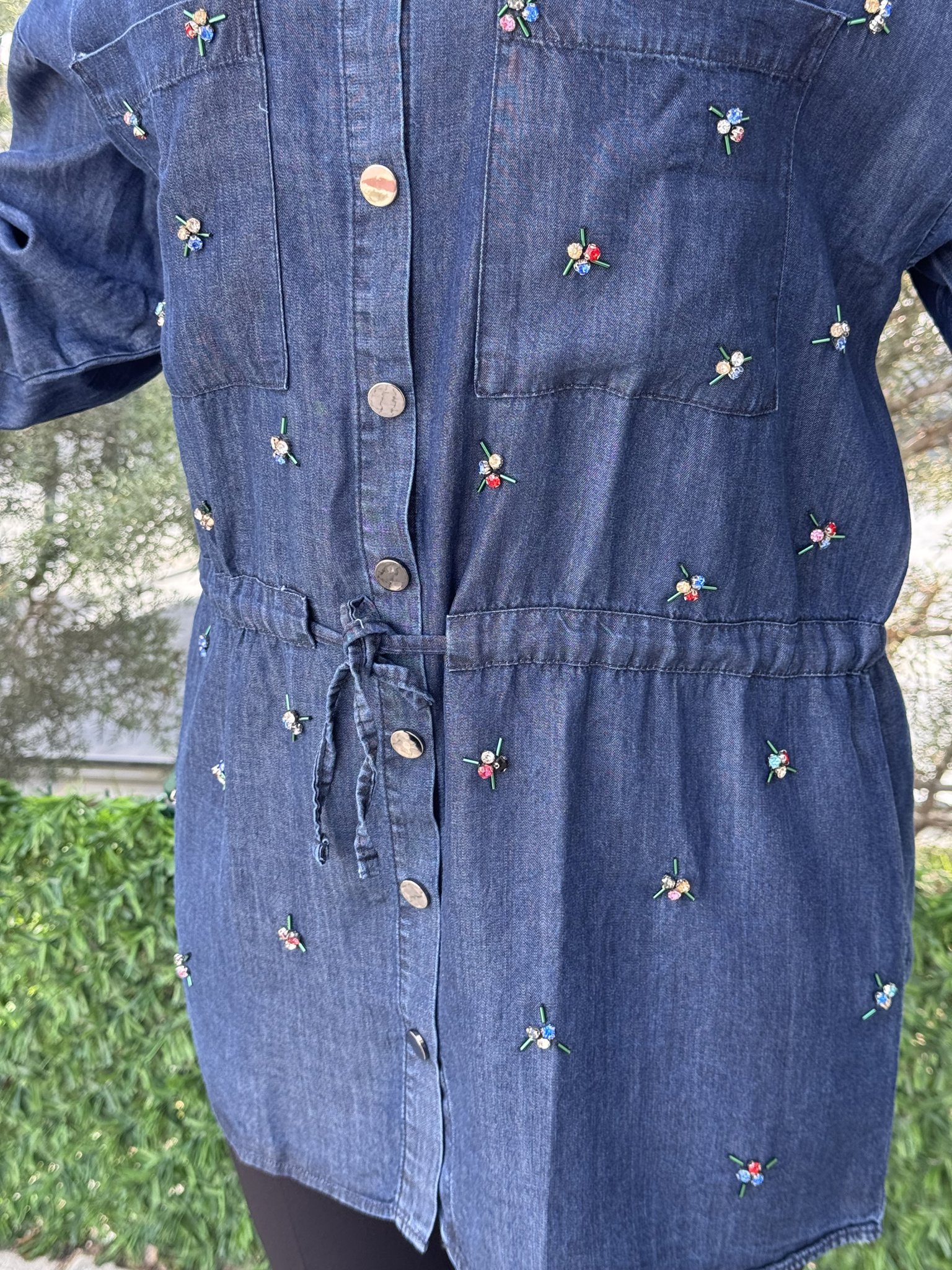 RENKLİ TAŞ DETAYLI OVERSIZE KESİM TENSEL GÖMLEK